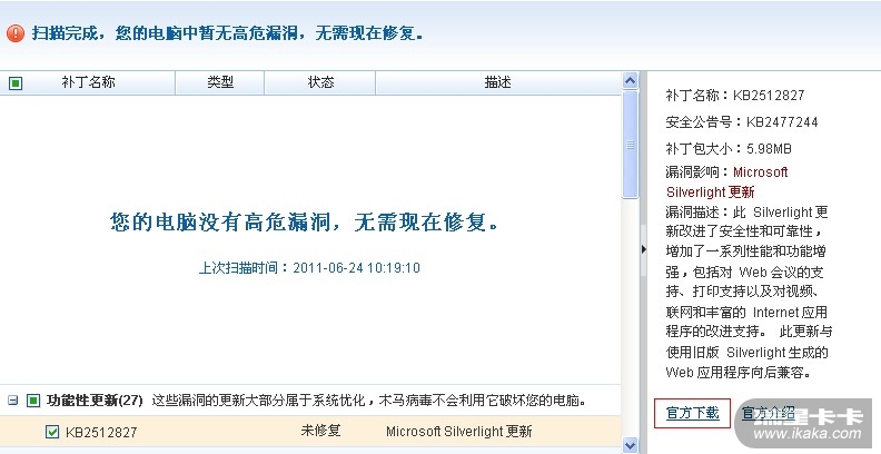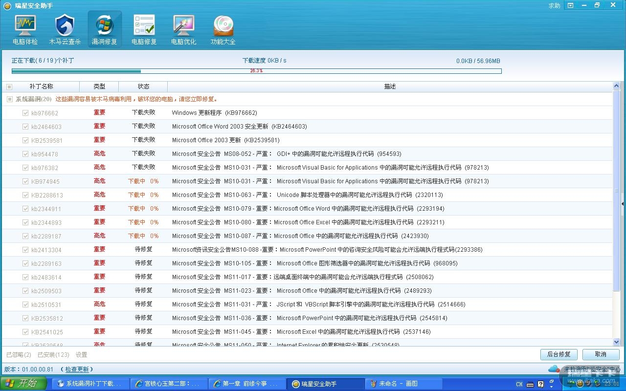 瑞星安全助手,昨天上午一开机就提示有5个系统漏洞,跟以前一样打补丁的速度很慢(基本要用一天时间,因为总是下载失败),我以为是我们单位的网速慢,所以忍了。但是直到今天,其中的一个补丁就是下载到27.1%就不动了,还是个高危的补丁,我以前用360安全卫士就从来不会这样,难道要我再改回用360?:kaka10:
