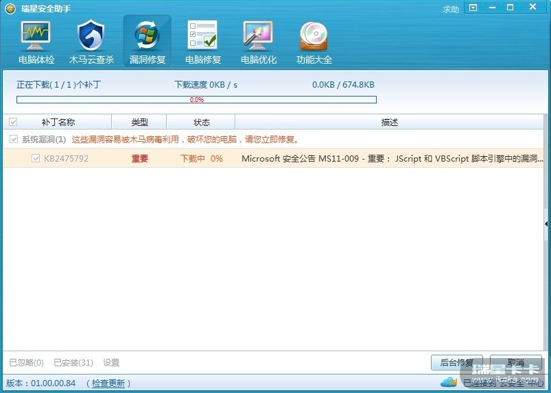 楼主使用瑞星安全助手手动下载补丁是否可以修复完成。