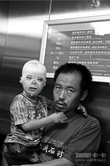 5岁的山西汾阳男孩湘湘不慎被柴火烧成3级重度烧伤,面部被毁容,左手四根手指被截肢,右手严重烧伤,无法伸展。植皮手术之后,湘湘的脸和手上留下了厚厚一层伤疤,虽然性命保住了,却从此不得不带着紧箍的头套面具生活,脸部也不能暴露在阳光照射下。他成了一名极其特殊的“面具娃娃”。