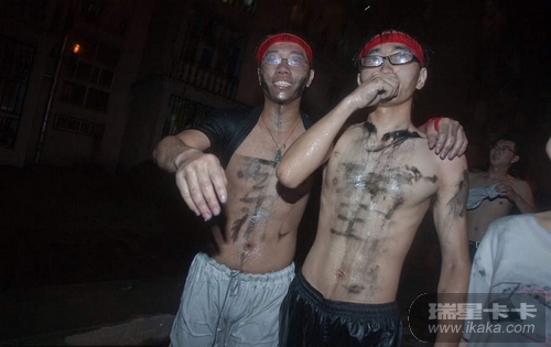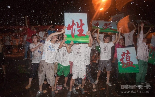 6月19日晚11点,华中科技大学,毕业生们手持本系的“口号牌”站在传说中的“公主楼”(华工韵苑女生宿舍楼)下毕业生们向女生不停“挑衅”,只求一泼。