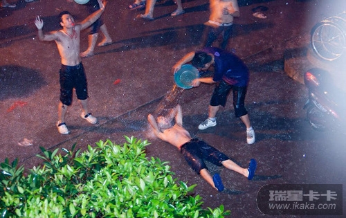 6月19日晚,华中科技大学的“毕业泼水大狂欢”,一名大二男生端着水直接朝毕业生学长头顶浇了上去。