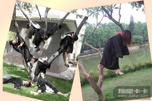 毕业生将自己“挂”在树上拍摄的毕业照。