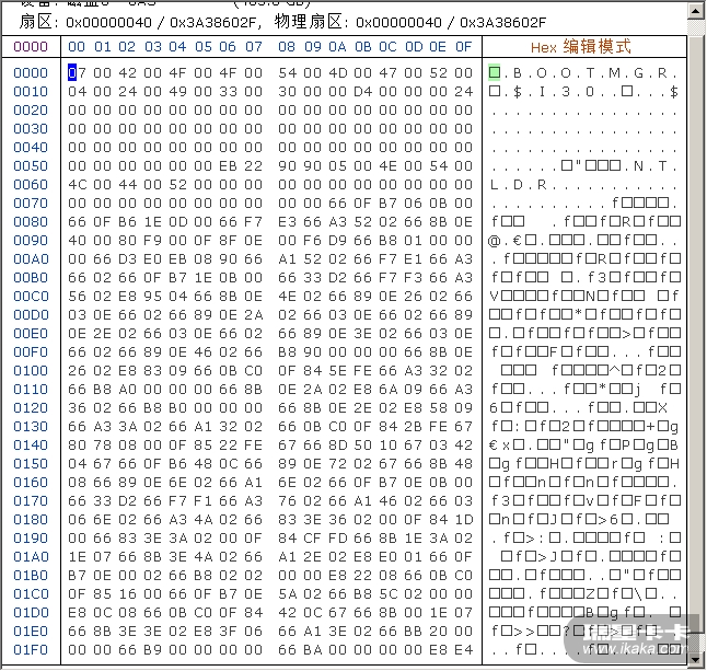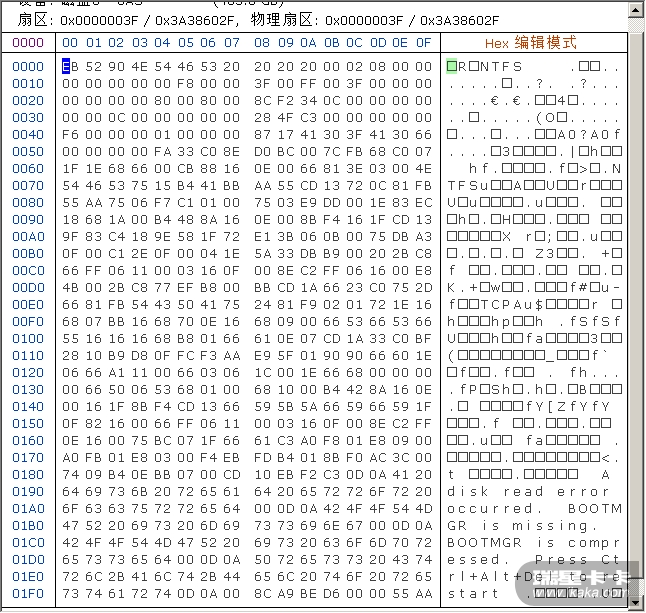 用SECTOREDITOR查看,第一个硬盘分区的PBR内容就是位于3F至47(16进制)这几个扇区。