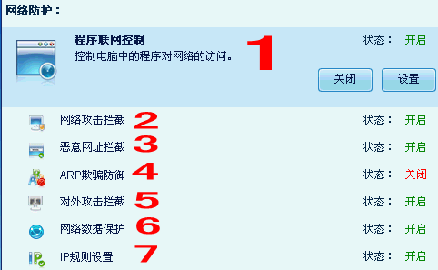 如下图所示,依次由1---7关闭瑞星防火墙的监控功能