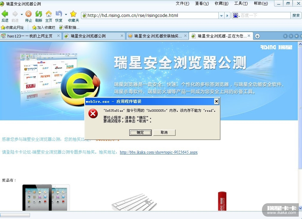 该图是刚安装上瑞星浏览器不久之后,因为按了两次领取抽奖码,然后发表了一张抽奖的帖子。就崩溃了。