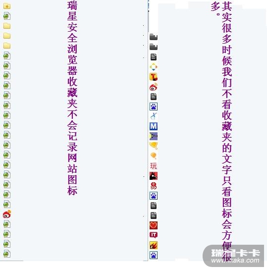 瑞星安全浏览器收藏夹里的网站图标是不显示的,其实很多时候没人仔细去阅读收藏夹网站文字信息,只要看一眼网站的图标就知道这个什么网站,这样查找会很方便,建议瑞星安全浏览器在导入收藏夹时或添加收藏夹时同时也能记录网站图标缓存。