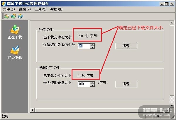 可以尝试使用瑞星的下载中心管理工具(开始→瑞星杀毒软件网络版→工具→下载中心管理工具),点击“已经下载”,查看已经下载的升级文件和补丁文件的大小(如图),如果是由于此文件过大,可以设置保留版本的个数和补丁使用硬盘大小后点击“清理”按钮进行清理。