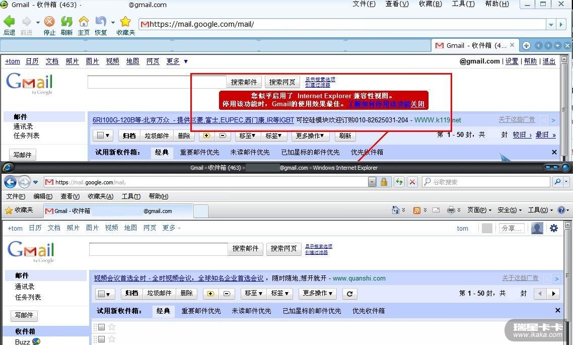 木有问题呀! 红线下面指的就是IE8打开GMAIL的样子,没有兼容提示哦!