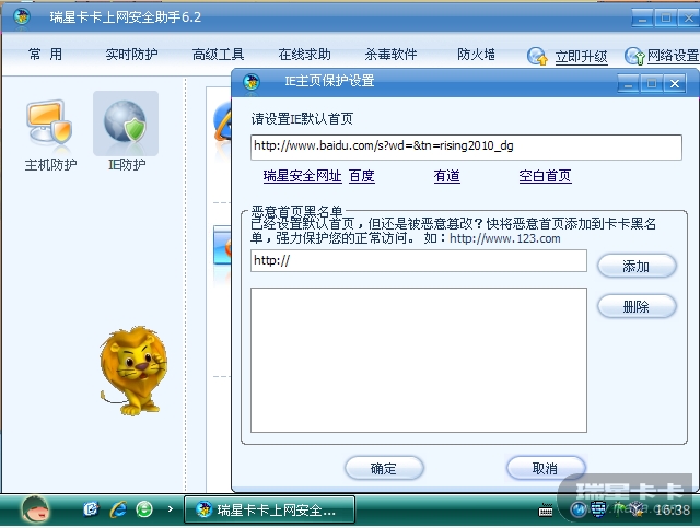 进入瑞星卡卡上网安全助手 实时防护 ie防护 ie主页保护 修改设置 添加自己喜欢的主页 即可