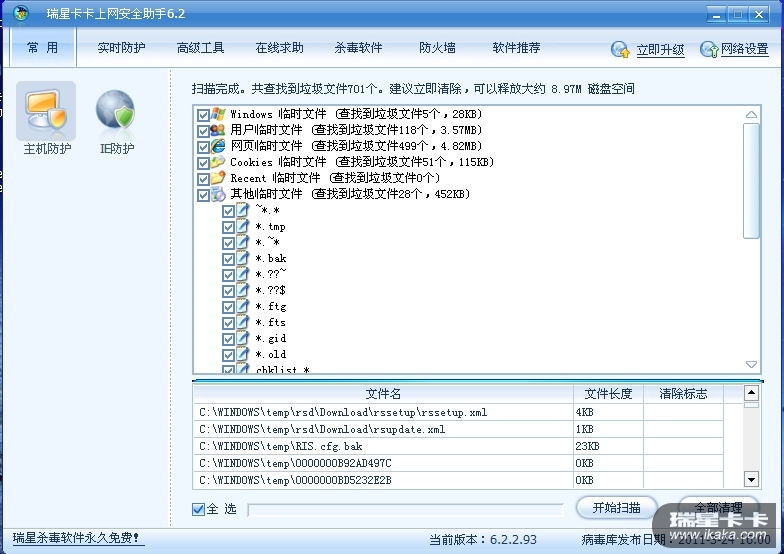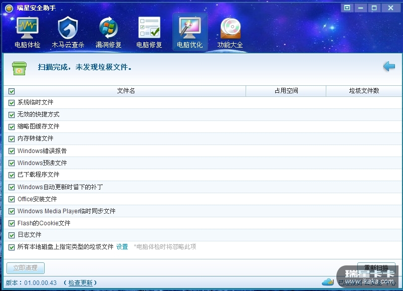 瑞星安全助手扫描垃圾文件甚至还不如瑞星卡卡。不要说设置问题,我已经把所有扫描内容都打勾了,包括设置中的扫描内容也打勾了,但扫描的垃圾文件依然那么少。希望多多增加一些扫描内容,可以把卡卡安全助手的搬上去。还有就是,瑞星安全助手清理垃圾文件时,明明已经把扫描出来的全部清理了,但安全助手依然在继续清理(就像是又扫描了一遍)这个问题一直存在。希望对其改进。对比图如下: