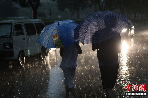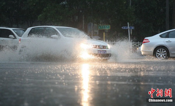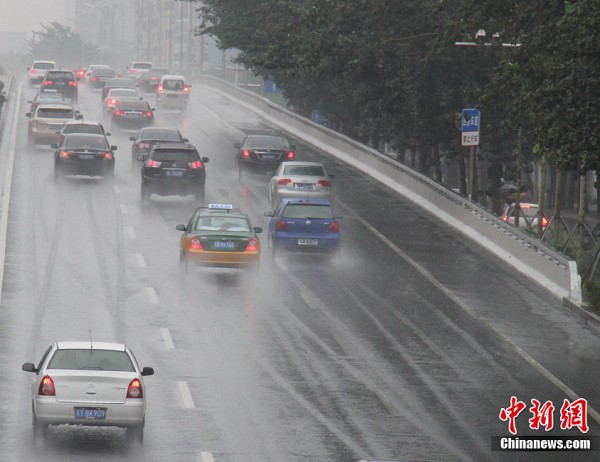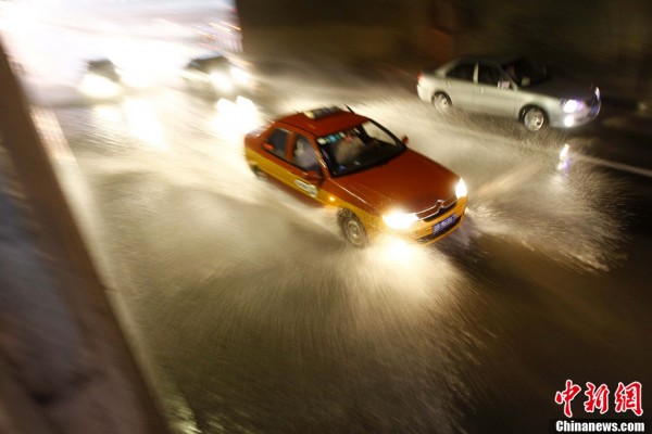 7月24日,北京城在经过一段极其闷热的桑拿天之后,终于在下午迎来了一场酣畅淋漓的暴雨。图为在雨中疾驰的汽车