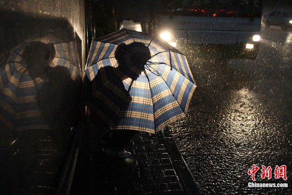 北京7月24日傍晚迎来大到暴雨,强降雨再次考验北京的道路、排涝等公共设施。北京市气象台14时左右分别发布了雷电黄色、暴雨蓝色预警信号。图为雨中等车的市民。