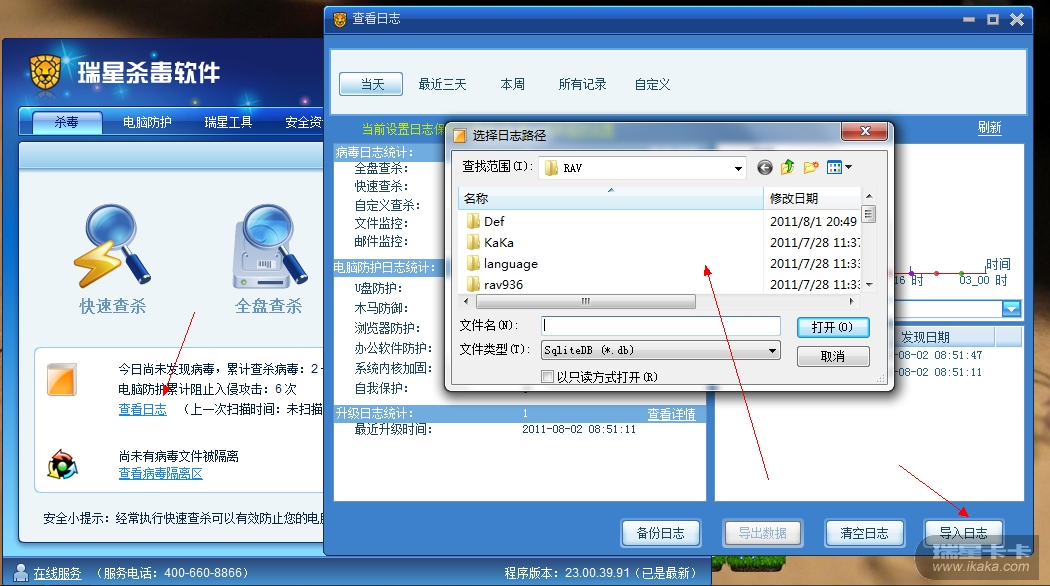 楼主可在瑞星---查看日志-----导入日志----选择 日志文件 打开