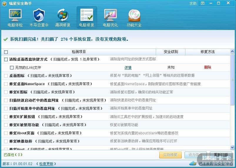 关于误删桌面宽带连接问题请将瑞星安全助手升级至最新版本判断。
