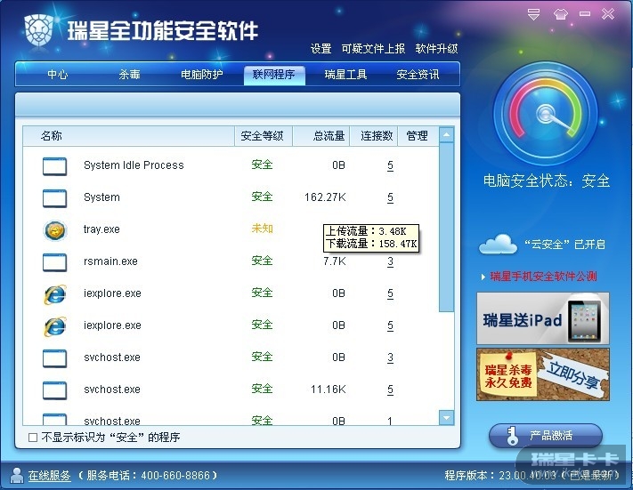现在我统一反馈2条问题一条是瑞星安全助手会误报宽带连接还请你们跟进解决这个问题,另外一个那就是瑞星安全功能2011,在查看联网程序会看见瑞星卡卡助手显示是未知文件,不知道这是什么原因,希望你们能解决这个问题