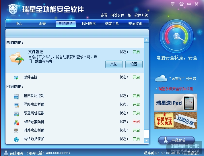 虽然64位系统下,瑞星的电脑防护功能较少,但其查杀能力并未受到太大影响,依然使用 智能云安全 瑞星反病毒虚拟技术 和 瑞星虚拟化引擎,全面、深度、极速查杀病毒,为电脑提供安全防护