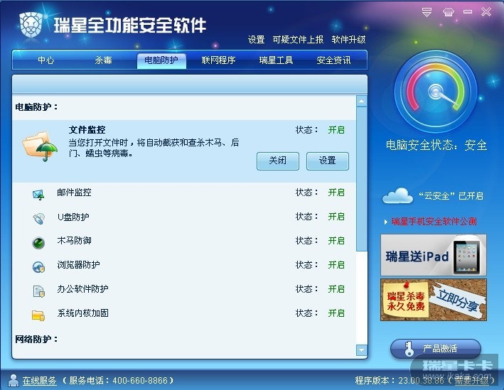 而在32位系统下,电脑防护包括:文件监控、邮件监控、U盘防护、木马防御、浏览器防护、办公软件防护、系统内核加固