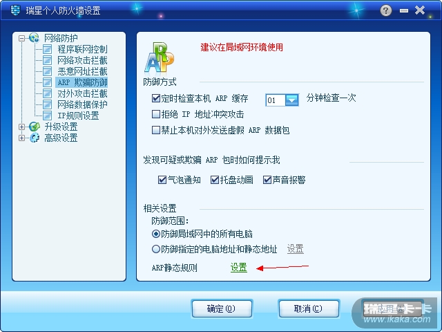 楼主可通过设置ARP欺骗防御,来防御局域网中的电脑