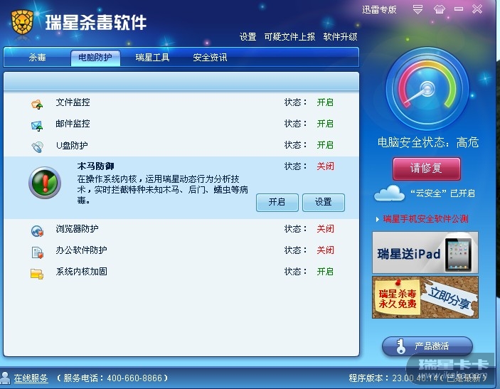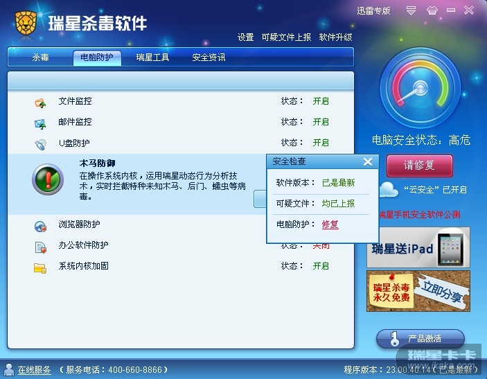 尝试在 我的电脑---管理---服务---重新启动瑞星的服务(Rav service、Rsd service),之后尝试修复 瑞星(不保留用户设置),如果不行,可完全卸载瑞星(不保留用户设置),之后重新下载安装。
