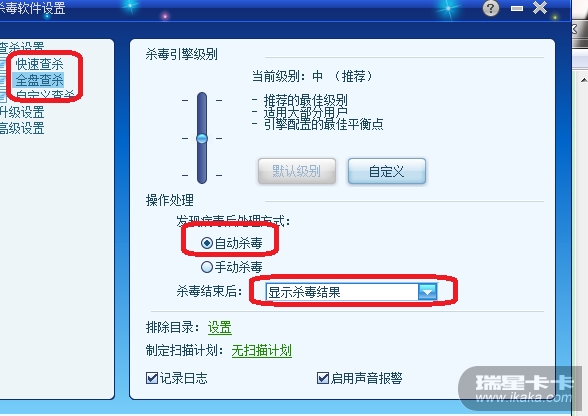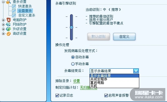 瑞星有这个功能的,你全盘或快速查杀里就有 你进详细设置里 把处理方式改为自动 里面就有几个选项 可以杀完后关机