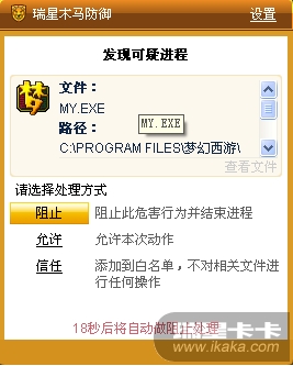 确认无毒后如果还提示,可将梦幻的进程在瑞星设置---电脑防护--木马防御,添加至白名单