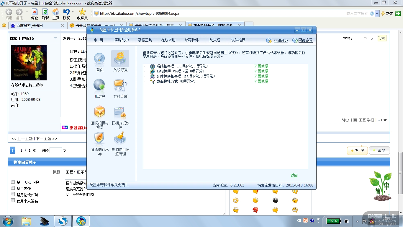 lz当前的瑞星助手版本是多少啊?使用的是一键修复还是什么修复啊?您的操作系统是多少位的?