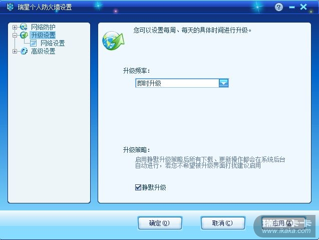关于更新设置,楼主可在防火墙升级设置里选为 即时升级,瑞星防火墙即可自动升级