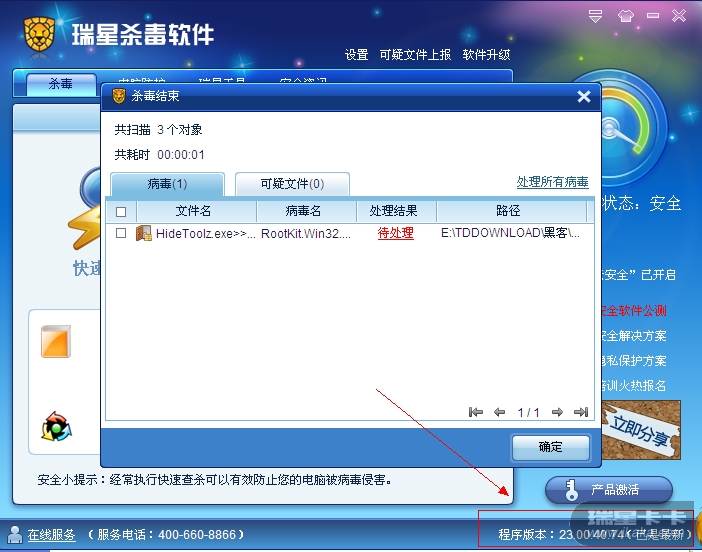 这是我使用瑞星杀毒软件最新版查杀结果与瑞星文件监控报警的截图: