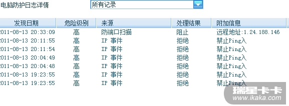 有人在利用漏洞扫描工具测试Ping为入侵做准备,瑞星报告有人Ping入,说明它已经拦截成功。