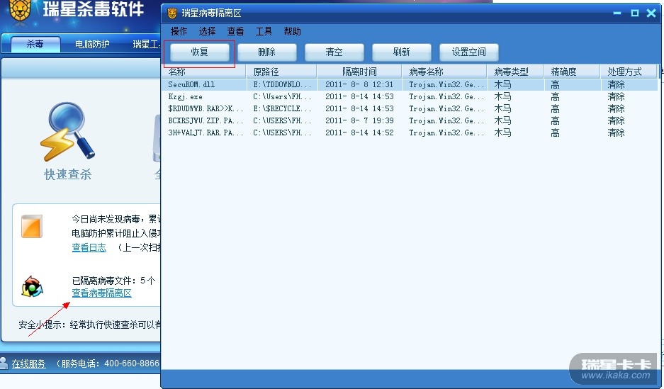 目前瑞星支持在隔离区恢复文件