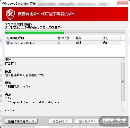 如题:windows defender查出一个名为Adware:win32/Rugo的文件,警报级别为“高”,用瑞星查不出来,说是一个广告程序,请问这个是不是病毒,该怎么处理?