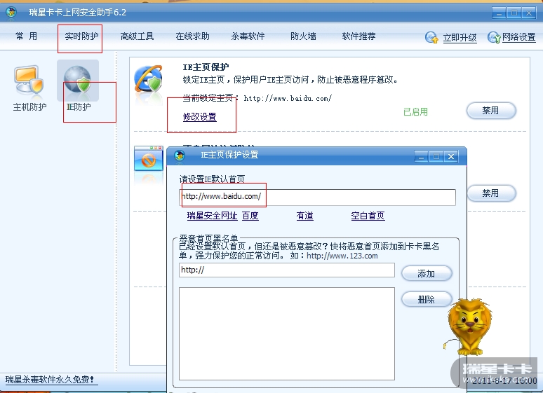 升级应该不会,是否是弹出了重要更新提示窗口,点击确定后更改的主页?如果不想用瑞星安全网址可以修改会自己的首页。