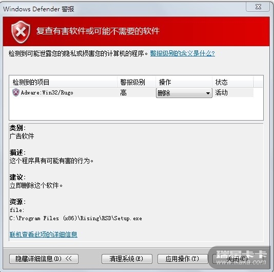 我是win7操作系统,近几日系统老是报查获“RsMgrSvc.exe”,并告诉为:可能泄露你的隐私和危害计算机的程序。经查:此文件在瑞星杀毒软件的文件夹里,进行过多次删除,可它还是会出现,请高手与以判断,是否向系统报告的那样,危害个人隐私和计算机程序;还是杀毒软件里的文件?还是系统有问题?谢谢高手帮助解决!急急急!!!