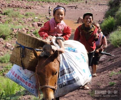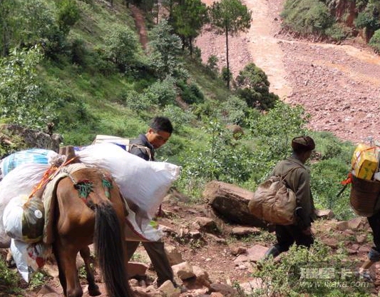 当我和爸爸终于来到凉山脚下一个叫做东河乡繁忙集镇的时候已经是星期天了。一个礼拜中的第七天,山民们从山中各个地方来到这个小镇出售或物物交换他们的东西或者休闲一下。我们是从西昌城坐越野车来到这个山镇的,西昌城里三位以前我们素不相识的爱心人士热情地帮助了我们,他们是黄红斌叔叔、徐旭叔叔还有李秋蓉阿姨。李阿姨还周到地为我们大家准备了午餐和水。到了东河乡再往前就得靠我们步行了。黄红斌叔叔通知了山里的罗老师(彝族名字:布夫其尔)来接我们。和罗老师一起来的还有他的太太和一匹马。罗老师看到我们以及捐赠物资如书包和衣服等很高兴。我们整理了一下肩背的行装,帮助罗老师把东西绑在马背上之后一小群人就出发了,罗老师的太太(彝族名字:阿侧伍各)和别的山民妻子们走在前面。