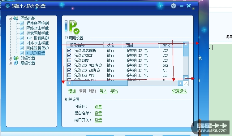 瑞星防火墙IP规则默认还是手动全部打上勾?