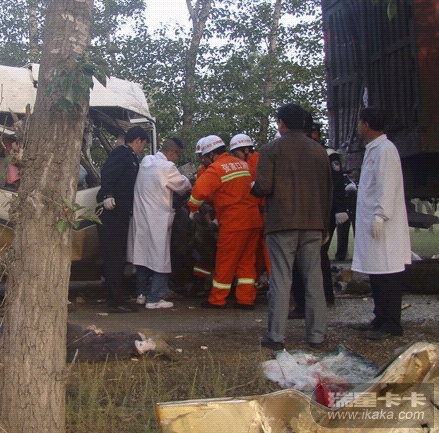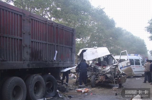 8月28日5时10分许,尚义县南壕堑镇西平山村班定营子自然村岳建兵驾驶白色依维柯载有34人沿401县道由南向北行驶从尚义县城到大青沟镇,行驶到三义店村北路段时,与前方顺行停在路右侧的张家口市宣化区庞家堡镇花家良村花智勇驾驶的汇达牌重型半挂车(冀GN281挂)发生追尾。事故造成18人死亡、16人受伤。死伤者均为凌晨赶往打工地的摘菜农民。图为事发现场.