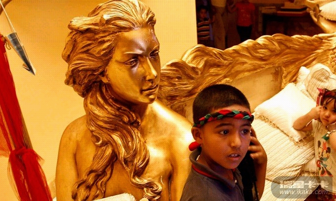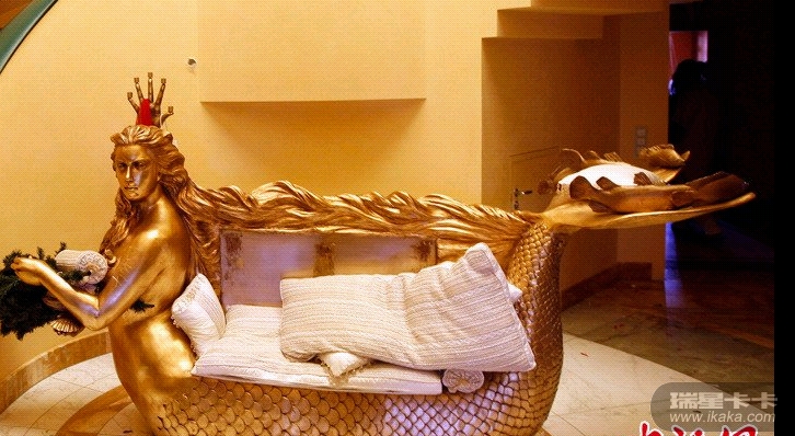 8月26日,拍摄于卡扎菲女儿阿伊莎住宅内的镀金沙发,沙发一头是阿伊莎的头像,造型就像一条美人鱼。阿伊莎的头像还出现在很多其它房间内。