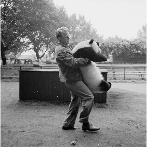 1938年,五头大熊猫从中国非法走私到了英国,其中四头被伦敦动物园购买。图片中是当时给大熊猫拍照的摄影师Bert Hardy的儿子被大熊猫拍照的场景。
