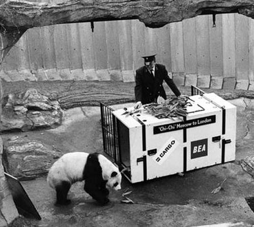 20年之后,在1958年英国人又迎来了一头名叫琦琦(chi-chi)的母熊猫。当时正值冷战,这头熊猫是一个奥地利人用一批非洲动物跟北京动物园交换所得的,本来是要运到华盛顿动物园的,但因为美国当时全面封锁跟红色中国的一切贸易往来,琦琦也被禁止入境。最终落户到了伦敦动物园。