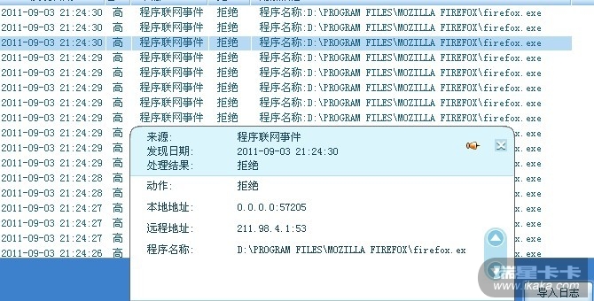瑞星防火墙一开,IE、火狐等浏览器就访问不了网页。日志截图请看附件!