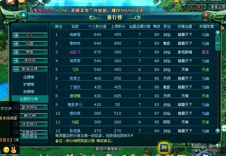 下图是凡人修真2011年9月4日仙盟积分的最后排行,第一名是梅静雪,第二名是蓉妹妹,而且下面标注的很清楚:每周盟运积分第一,可获炫阳碎片,那么请问为什么炫阳碎片却分配给了蓉妹妹,是暗箱操作,还是游戏有托呢,别人不给碎片?