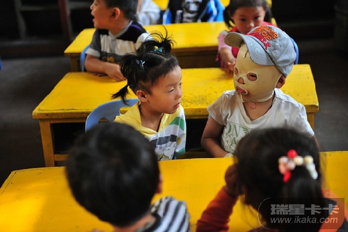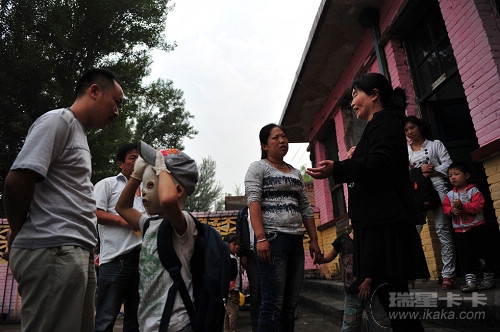 记者跟随王寿武一家前往学校,因为走得比较早,到学校后,大门还没有开,湘湘就趴在门上向里面好奇地张望着。过了一会儿,其他小朋友陆续来到学校,戴着面具的湘湘引起了孩子们的注意,但湘湘没有觉得自己和其他人有什么不同,甚至在几个孩子被他吓哭后,他还走过去安慰人家。