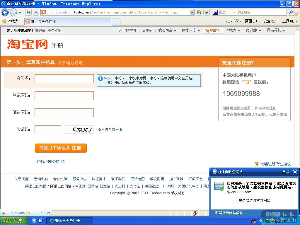点击淘宝官网的免费注册时,全功能的安全防护提示是钓鱼网站。