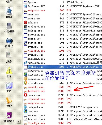 用冰刃查看隐藏进程!怎么不显示它的具体位置啊?
