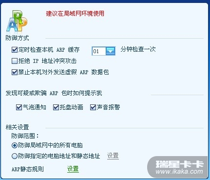 目前家中路由器在自己房中,用有线连接。。。隔壁房间使用的时无线网络连接路由器,瑞星防火墙安装在有线连接的电脑上。。。那ARP该如何设置 目前开启后,使用的是如下设置