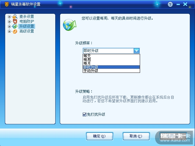 即时升级是你们的升级网站升级后让用户及时进行软件升级,是不是?应该是吧,因为我昨晚玩网游时卡了以下,然后发现右下角的任务栏处有瑞星的图标在动.