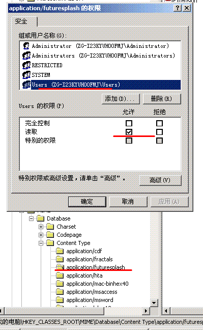管理员的账号登录到系统,在检查注册表中以下2项,确保受限用户(users组)有“读取”的权限