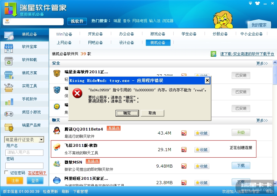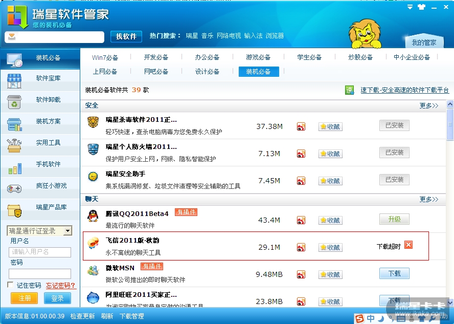 打开管家装机必备界面,点击 飞信2011版.秋韵 ,提示下载超时:图2