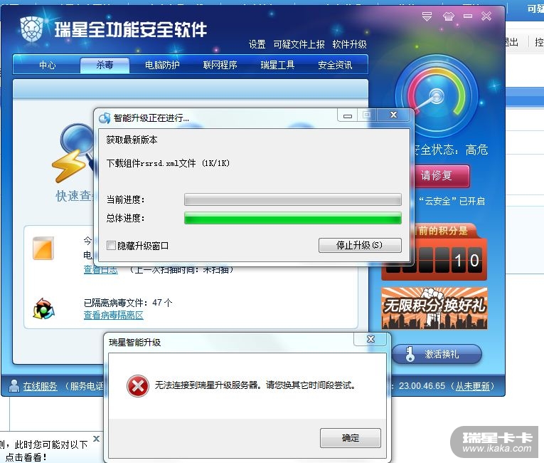 日开始升不了级了,原来装的是杀毒和防火分开的,今天重新安装了瑞星全功能安全软件也是一样啊!升级设置的网络连接测试都正常啊!截图如下