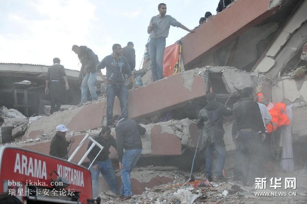 10月23日,在土耳其东部凡省,两名男子尝试从废墟中寻找物品.据土耳其道安通讯社23日报道,到目前为止,土耳其东部凡省地震已造成85人死亡、500多人受伤.土耳其伊斯坦布尔地震研究中心已将凡省当天发生的地震级别由先前公布的里氏6.6级上调为里氏7.2级,并估计此次地震可能造成数百人死亡.